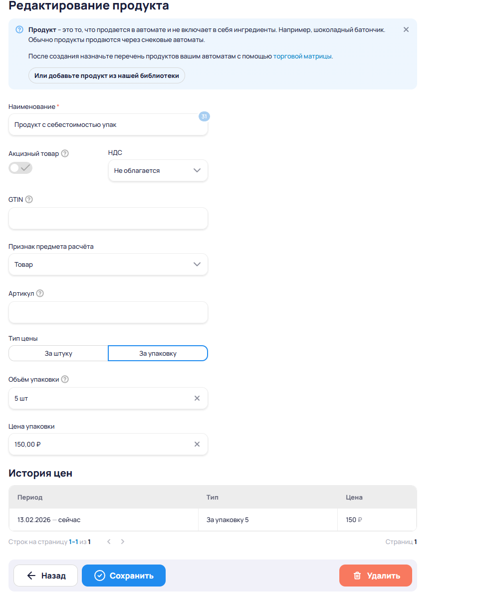 — Расчёт прибыли – Позволяет добавлять, редактировать закупочные цены для ингредиентов и продуктов. Для торгового автомата появится возможность настроить показатели аренды, административных расходов и возможность указать текущие расходы.